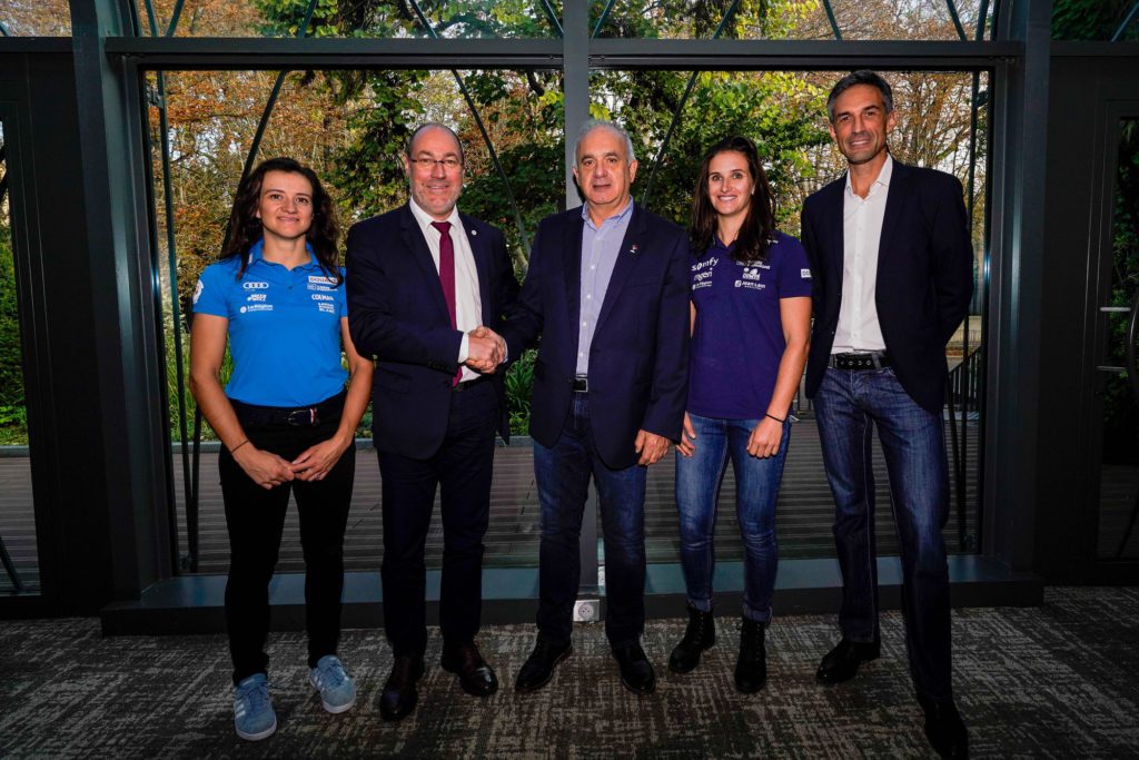 Coralie Frasse-Sombet, Membre de l’Equipe de France de Ski Alpin, Fabien Saguez, Président de la FFS, Christian Frison-Roche, Président du Pool, Julia Simon, Membre de l’Equipe de France de Biathlon, Morgan Redouin, Secrétaire Général du Pool. Crédit : Agence Zoom