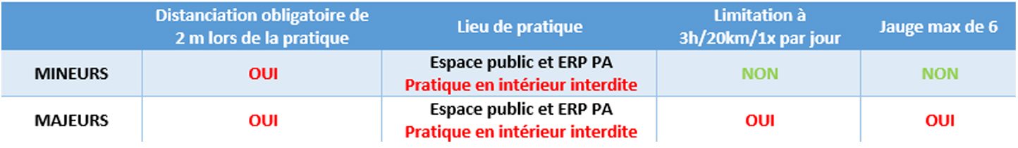 Pour résumer, la pratique des mineurs est désormais possible, dans l’espace public et les ERP PA, sans limitation à 3h/20km/1x par jour et sans application d’une jauge maximum de 6 personnes.