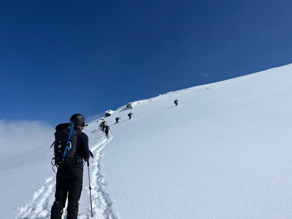 Le vendredi matin, après 30cm de neige tombés dans la nuit, 18 participants sont partis pour une première sortie sur l’itinéraire sauvage de la station. Malgré une météo difficile, un groupe atteint le Cap de Toudous avant de redescendre dans une neige poudreuse. Ils ont pu bénéficier l’après-midi d’une présentation sur les facteurs humains par Alex, le formateur.