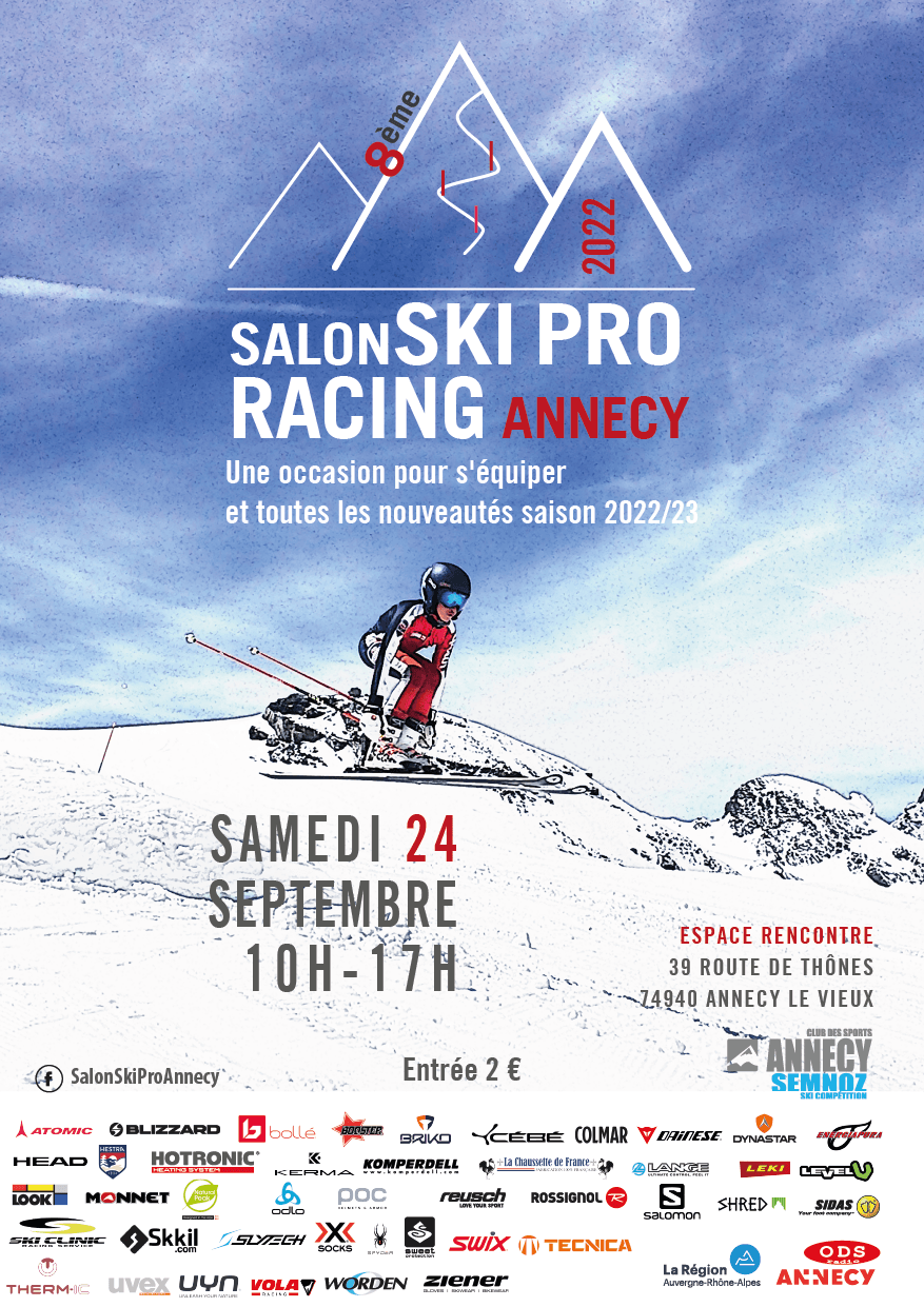 Le Club des Sports d’Annecy Semnoz organise la 8e édition du Salon Ski Pro Racing ce samedi 24 Septembre, de 10h à 17h à l’ESPACE RENCONTRE d’Annecy-le-Vieux, 39 route de Thônes.
